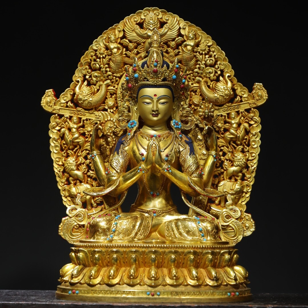 - 【超珍館蔵】銅製 塗金 四臂觀音像 仏像 宗教 仏教古美術 供養品 古賞物 古董品 古美術品 時代物 旧家蔵出 稀少珍蔵品
