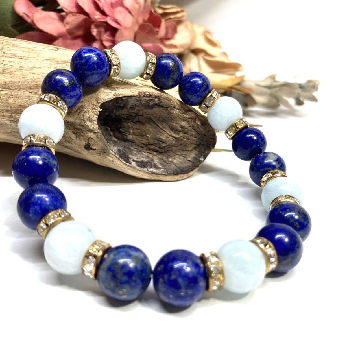 > ラピスラズリ&アクアマリンパワーストーン ブレスレット 天然石ブレス (ゴールド) 10mm メンズ・レディース 魔除け ☆