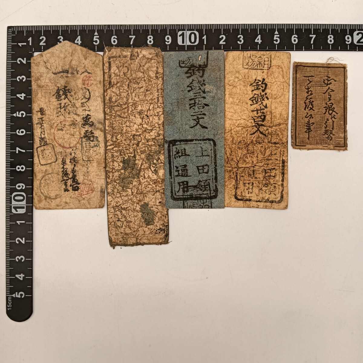 - 【A3557】江戸〜明治時代 古札 藩札 私札 青札 朱印 貨幣 古紙幣 古文書 骨董品 アンティーク 5枚まとめ
