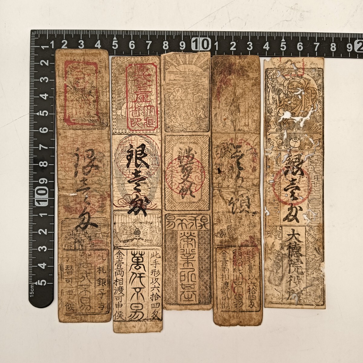 - 【A3554】江戸〜明治時代 古札 藩札 私札 朱印 貨幣 古紙幣 古文書 骨董品 アンティーク 5枚まとめ