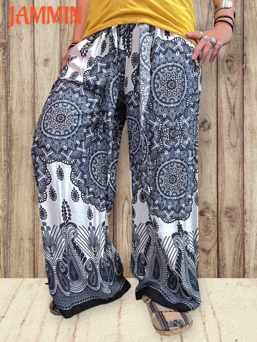 - ペーズリー紋様柄パンツ アジアン エスニック ヒッピー ココナッツバックル付き