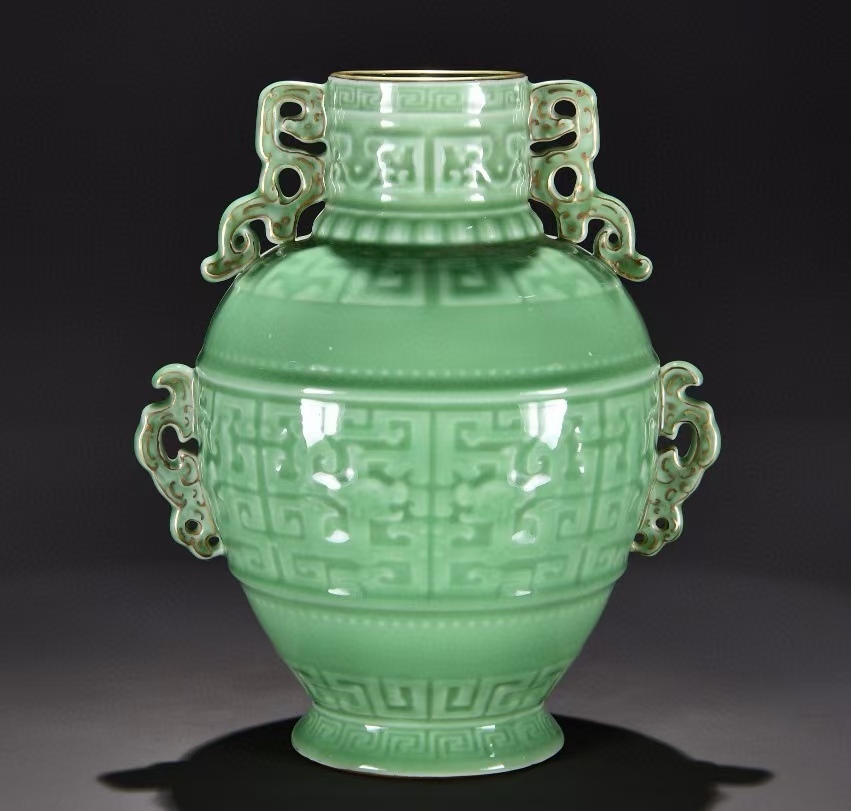 > 磁器 花瓶 秘藏 清代 乾隆年製 豆青釉回龍紋蒔絵金瓶 酒器 茶器 唐磁 染付 陶磁器 收蔵品 古美味 時代物 古美術 古置物 珍品 中國文玩6.23