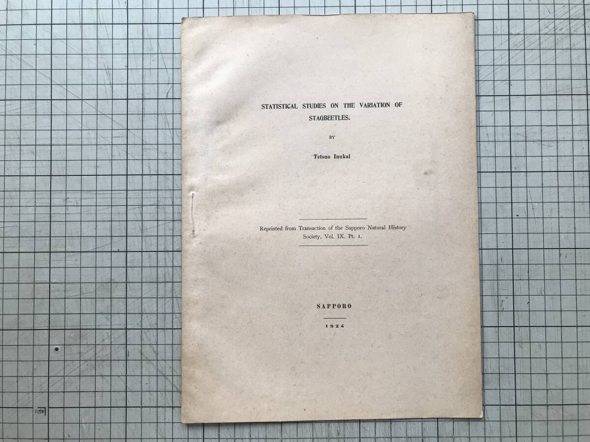 > 『STATISTICAL STUDIES ON THE VARIATION OF STAGBEETLES. クワガタムシ変異の統計学的研究 別刷』犬飼哲夫 1924年刊 ※札幌 他 00301