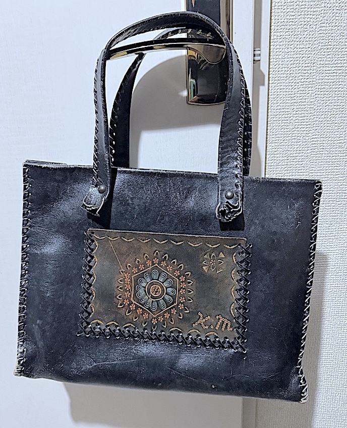 - 本革 ビンテージ ハンドメイド レザートートバッグ 手縫い装飾 X.M刻印 手彫りの花模様 ブラック