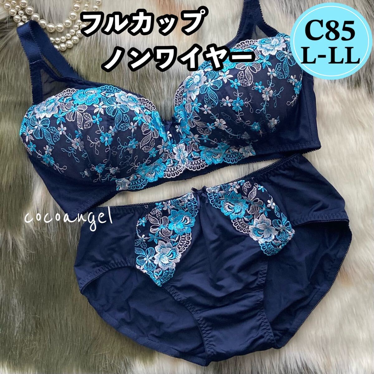 - ラスト【C85L-LL ネイビー ノンワイヤー】新品 フルカップ ブラジャーショーツ Cカップ パッドなし パンティ 花柄刺繍 女装 大きいサイズ