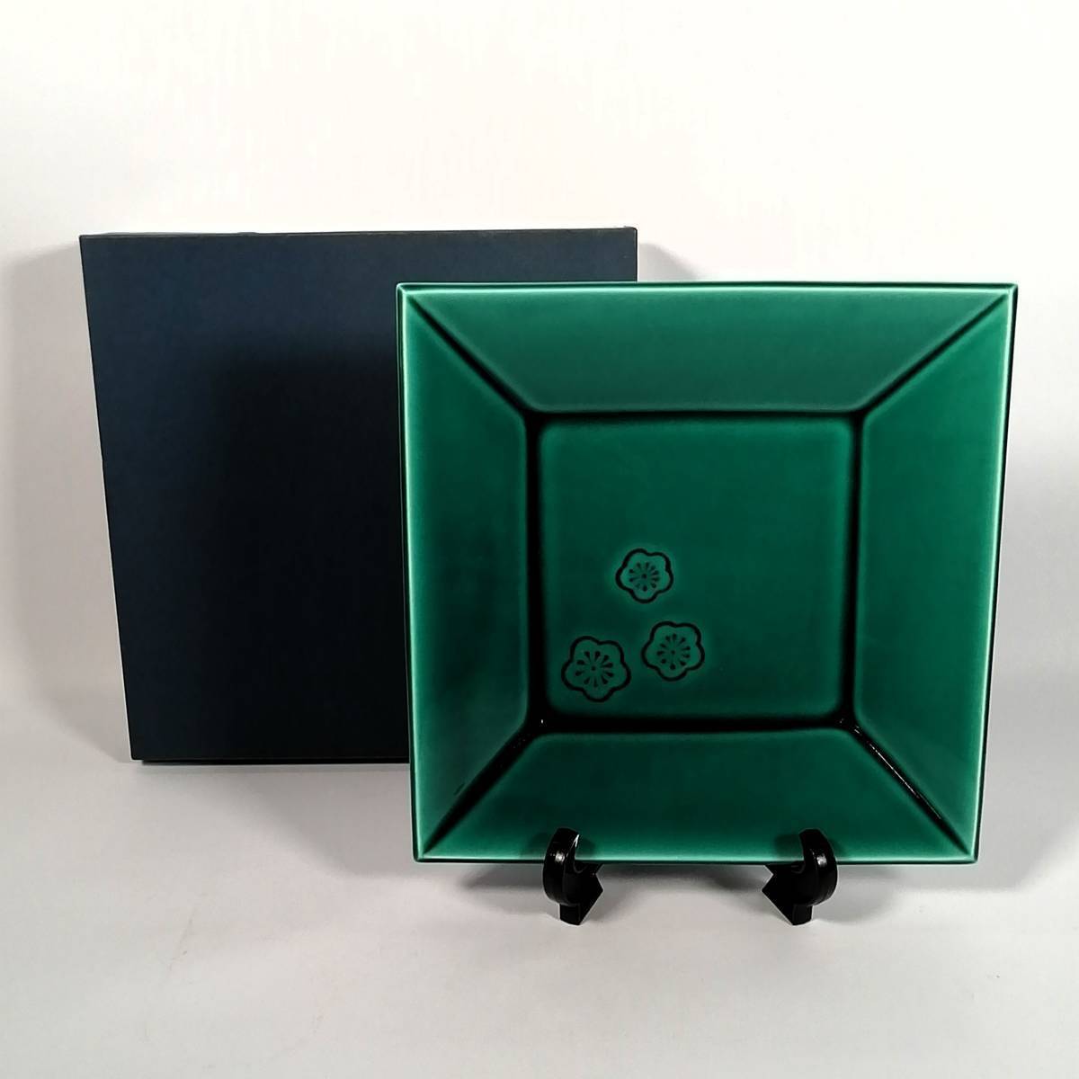 - 未使用 梅紋 菓子皿 緑 銘々皿 角皿 緑交趾【アウトレット品】 22 00012