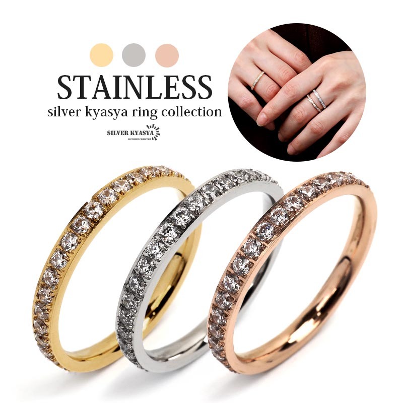 - (シルバー、16号) ステンレス フルエタニティリング 3カラー ゴールド シルバー ピンク CZ 細み リング
