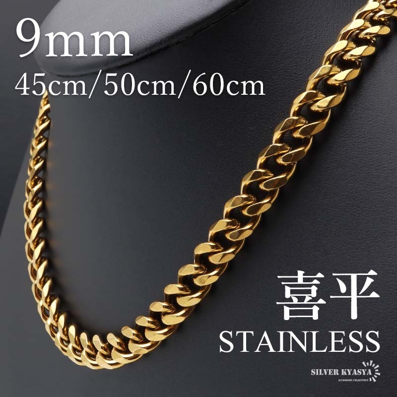 - (60cm) ステンレス 喜平ネックレス チェーンネックレス 幅9mm ゴールドネックレス 18KGP 太め メンズ 金アレ