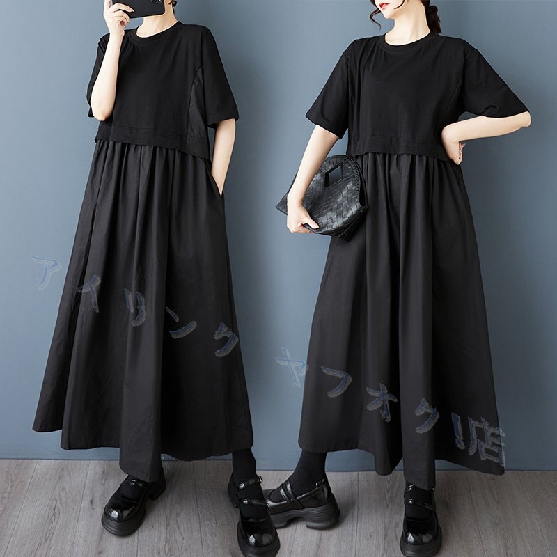 - 新品★夏 カジュアル 20304050代 ゆったり大きいサイズ 切り替え重ね着風半袖ロングワンピース 黒