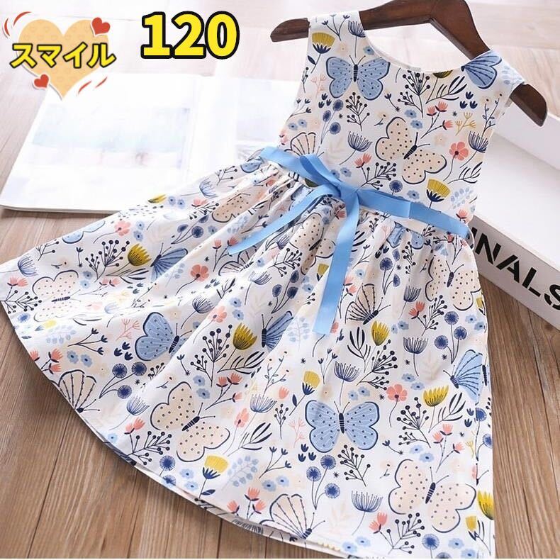 - キッズワンピース 蝶、花柄ノースリーブ リボン 夏物女の子服ブルー120