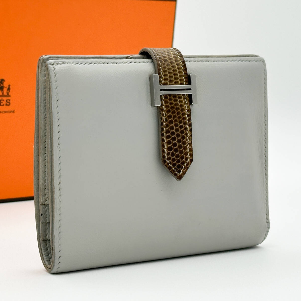 - HERMES エルメス べアンコンパクト リザード □R刻印 グレー