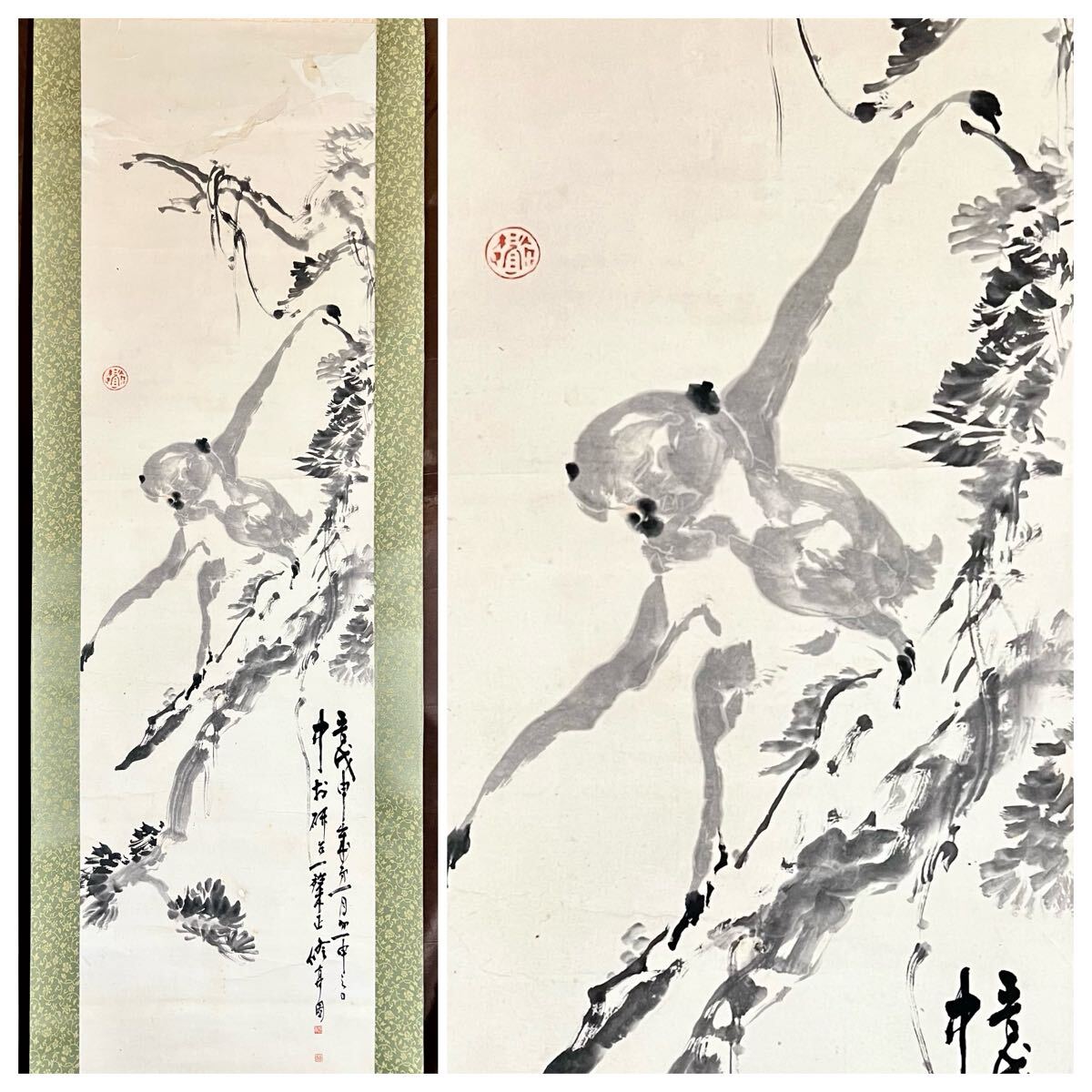 - 【真作】【S8】斎木修亭「手長猿之図」紙本 肉筆 花鳥図 鳥獣 絵画 書 掛軸 明治-大正時代の日本画家 長野の人 師: 児玉果亭