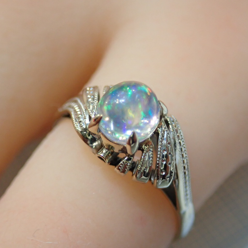 > ■K14WG ウォーターオパールリング 0.66ct■指輪■8号 1.9g■彫り模様 ミル打ち■中古磨き仕上げ■10月誕生石■