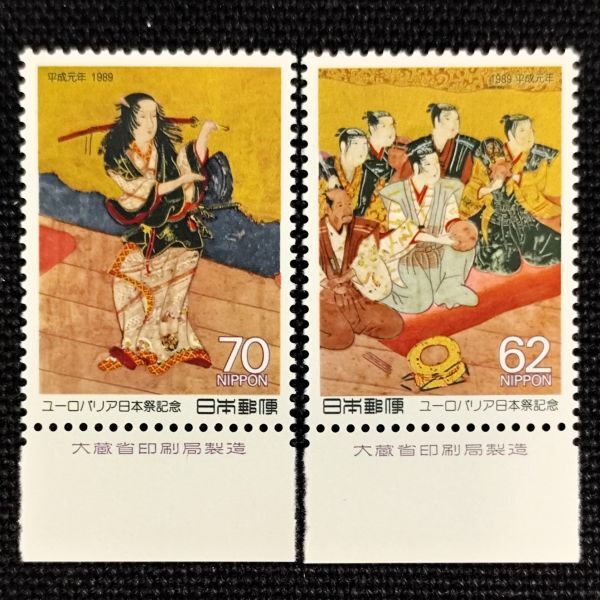 - [25062828]【ユーロパリア日本祭記念】単片2種 銘版付「紙本金地著色阿国歌舞伎図」62+70円 1989年発行 美品