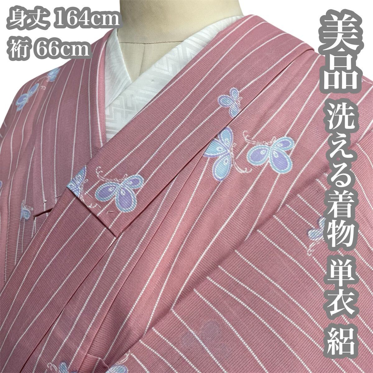 > #H456 美品 洗える着物 単衣 絽 ポリエステル 蝶々 身丈164cm 裄66cm 和装 和服 夏物 着物【wellriver】
