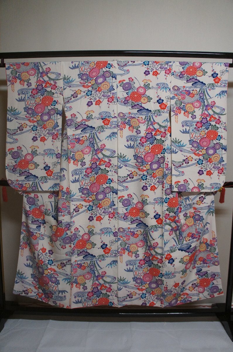 - 子供着物正絹アイボリー色地紅型調流水花模様小紋[C16285]