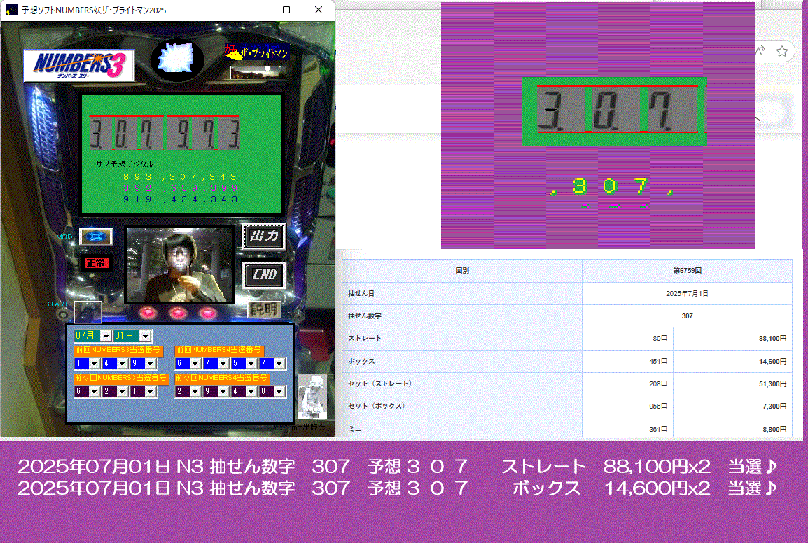 > 夏新作ナンバーズ予想ソフト『 予想ソフトNUMBERS妖ザ・ブライトマン2025 』2025年07月01日 N4 ストレート 1,013,100円x4 当選