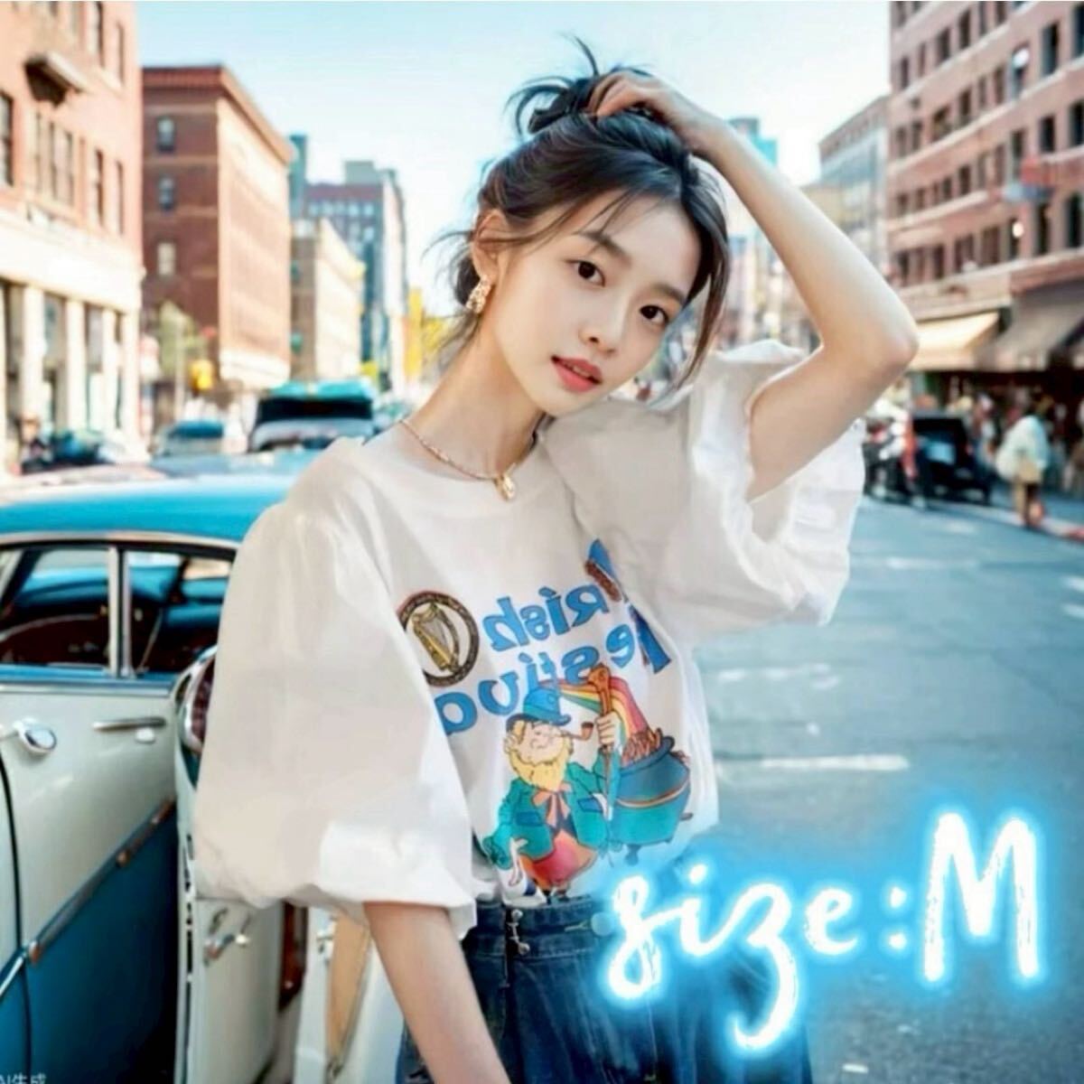 > y2k バルーン袖 Tシャツ 五分袖 韓国 レトロ イラスト パフスリーブ M