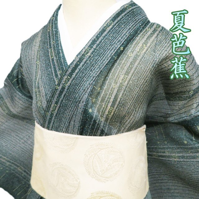 - 夏物 夏着物 夏芭蕉 絹芭蕉 着物 中古 正絹 カジュアル 縞模様 深緑色 緑系色 身丈162cm 裄68.5cm M ワイド きもの北條 A1226-5