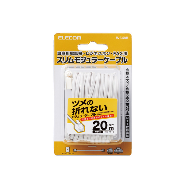 - ツメ折れ防止モジュラーケーブル 20.0m モジュラーコンセントと家庭用電話機・FAX・モデムなどを接続できる6極4芯タイプ: MJ-T20WH