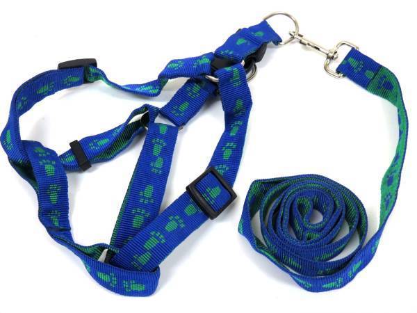 > 肉球柄 青 緑 XLサイズ 中型犬用 胴輪 ハーネス&リード セット 胴回り45~65cm リード 90cm 幅2.5cm ブルー ペット用品 散歩 新品 送料無料