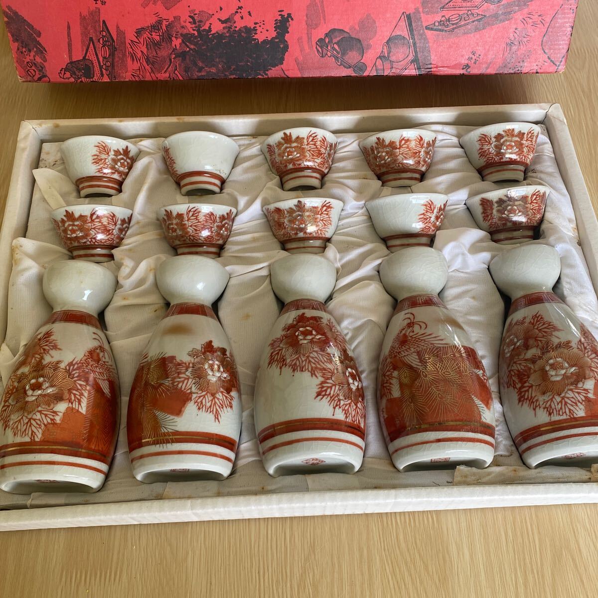 - 九谷岳山 赤牡丹孔雀 徳利 お猪口 酒器セット