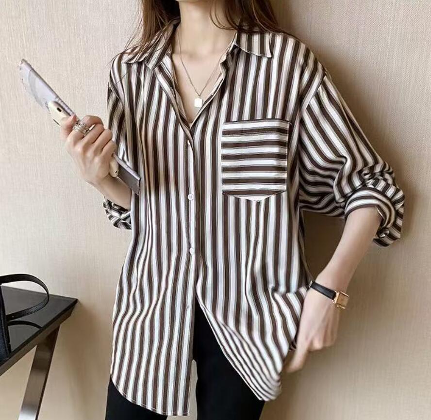 > 新入荷*シャツブラウス ボーダー柄 オフィス カジュアル ブラウス トップス レディース 大きいサイズ きれいめ 長袖 シャツ*カーキ