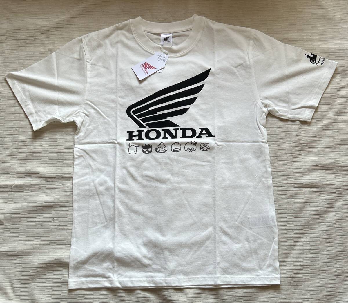 - 半袖Tシャツ Lサイズ HONDA/ホンダ バイクエンブレム サンリオ協賛 白地黒エンブレムHONDA柄
