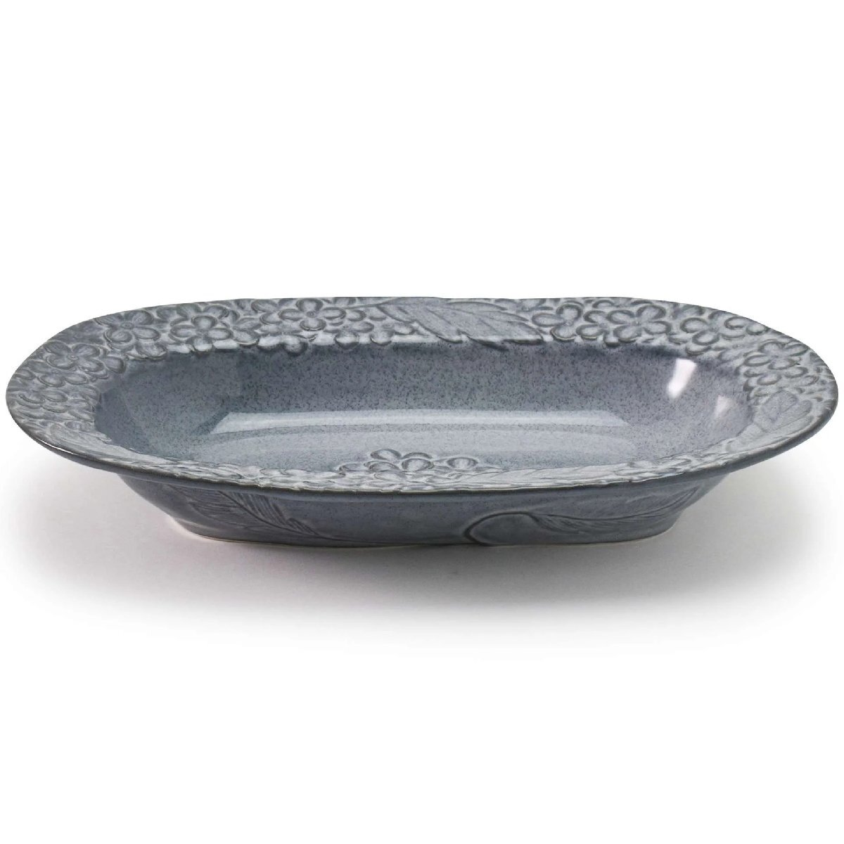 - 丁寧に彫られたレリーフの花模様が素敵な オーバルボウル 25.6×16.3×高さ4.4cm グレー 美濃焼