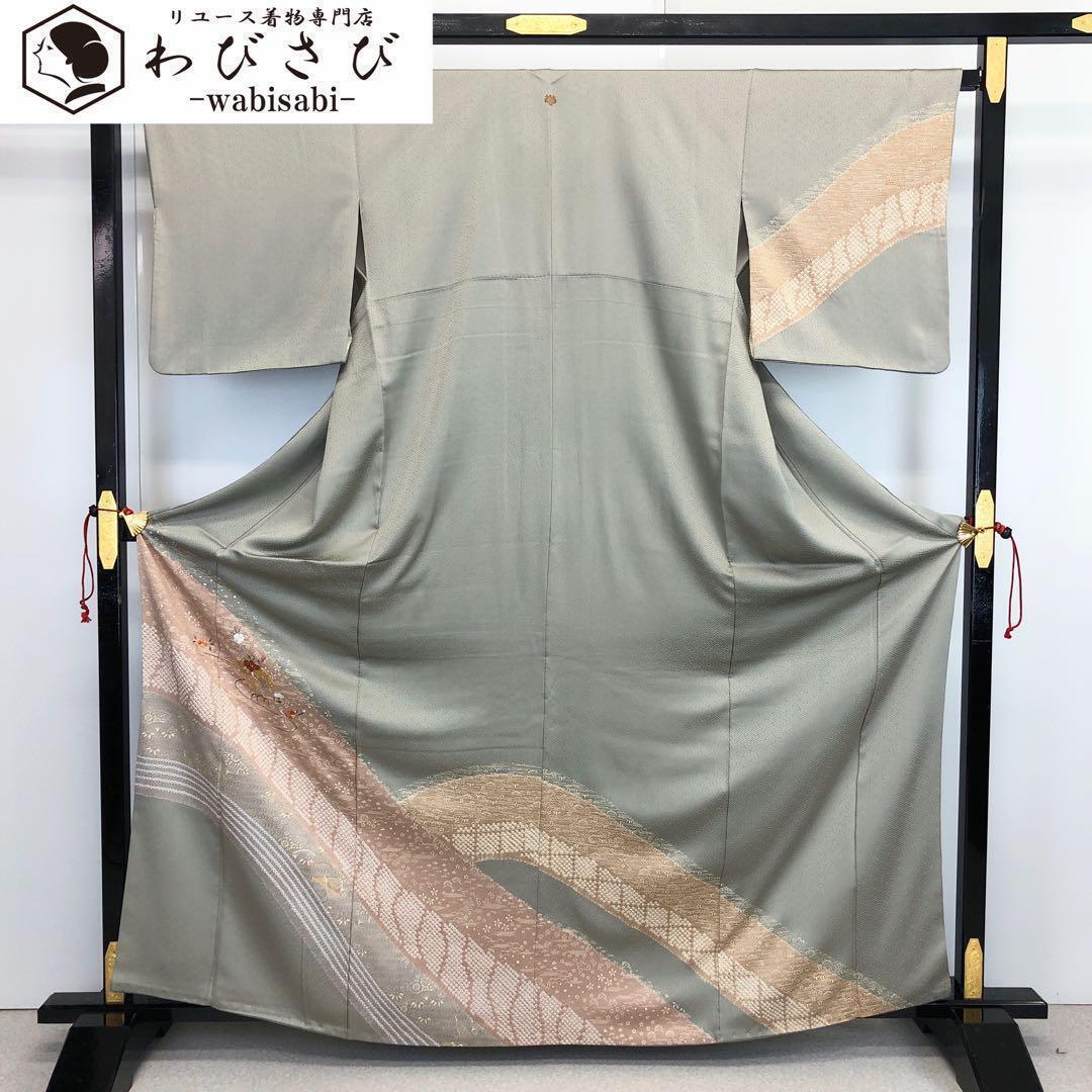 > 訪問着 絞り模様 花柄刺繍 金駒 金彩 紗綾形縞模様 蝋色 K-3664 着物 きもの kimono 和服 和装 中古 リサイクル着物 【送料無料】