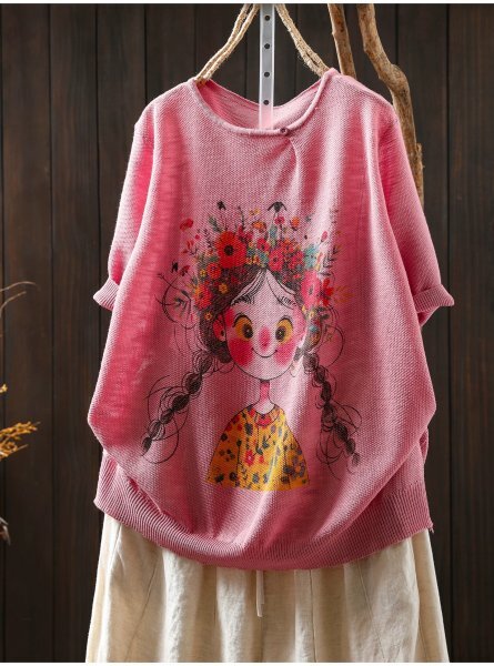 > 25zy サマーニット レディース トップス プリント柄 ラフ 麻タッチニット チュニック ナチュラル 麻混 サラサラ 涼感1