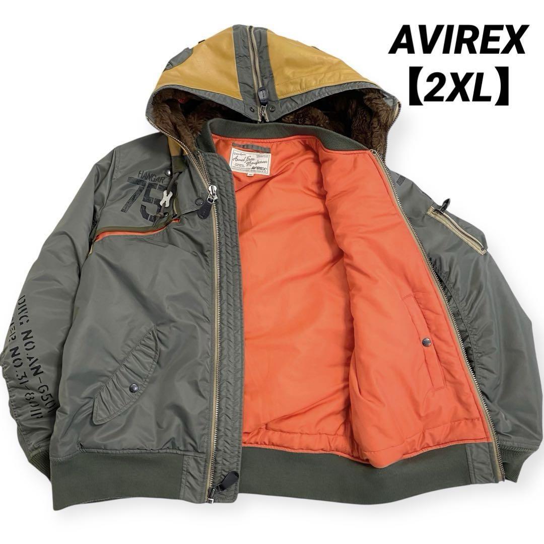 > 【激レア限定美品2XL!】AVIREX アヴィレックス MA-1 REMODEL MARK2 フード カーキ オーバーサイズ フライトジャケット ミリタリー レザー