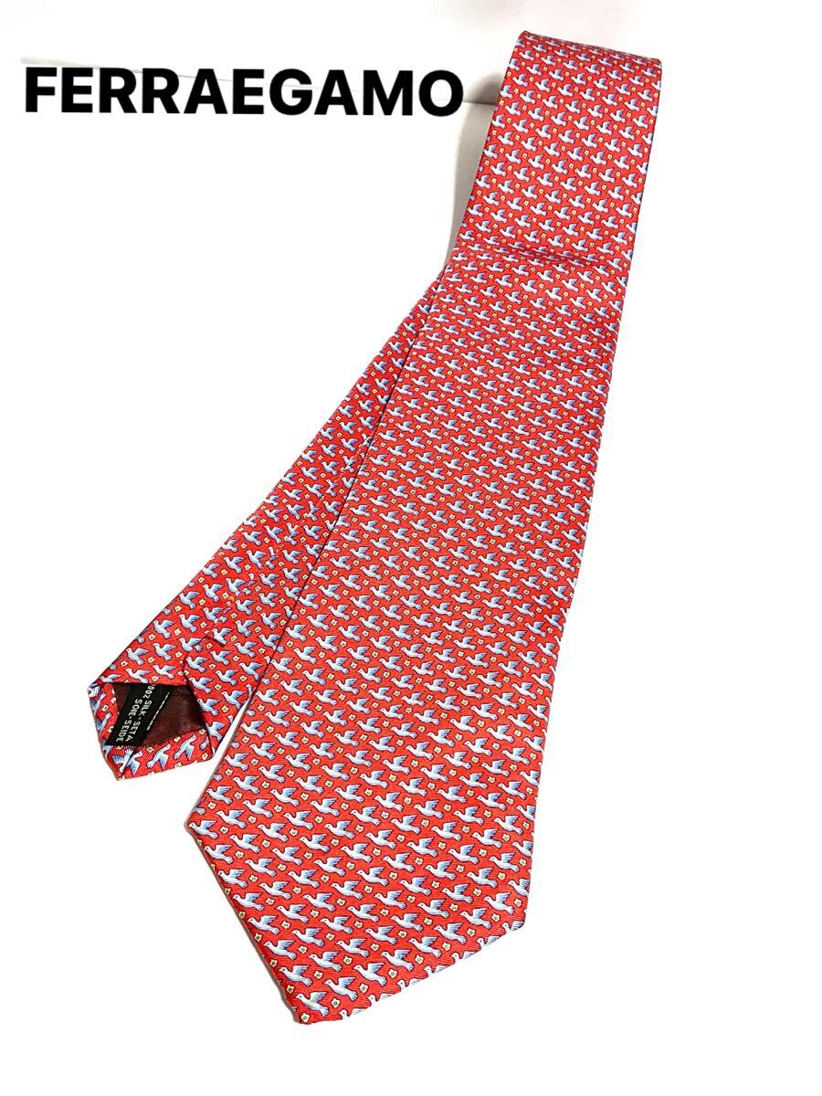 > FERRAEGAMO フェラガモ ネクタイ レッド×ブルー系 鳥 絵柄 ブランドネクタイ 送料185円(追跡付)〜