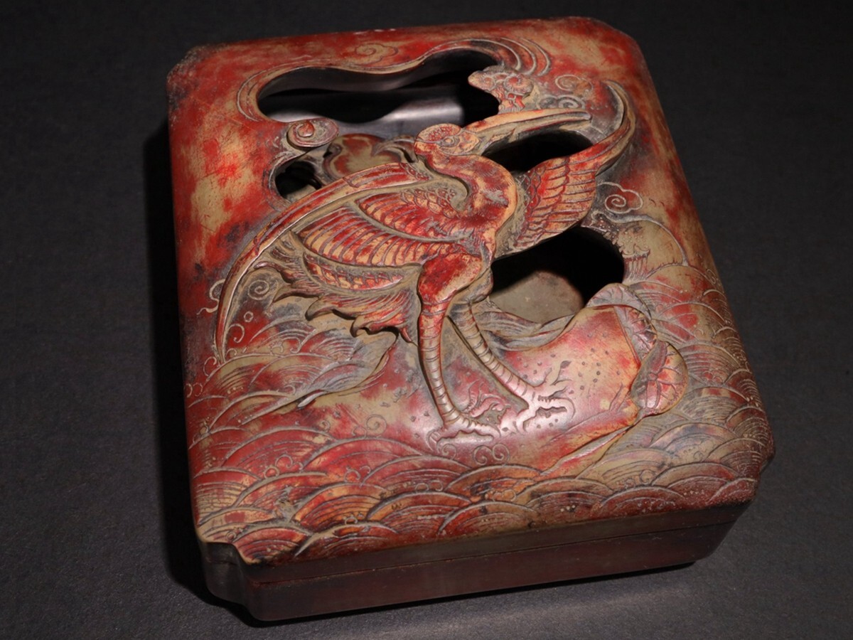 - 【瓏】老坑端石彫 福禄寿文房端渓蓋硯 朱硯 徐世昌銘 清時代 手彫り 文房四寶 書道具 中国古硯 古美術 蔵出