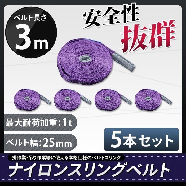 - 【送料無料】1t 3m ナイロンスリングベルト3m×1000kg×25mm ★荷揚げ 吊り上げ 吊り下げ 玉掛け運搬に!◆5本セット◆
