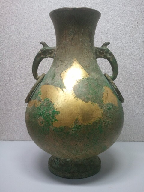 - ☆☆【美術 伝統工芸品・インテリア】青銅花瓶 花入 花生 青銅器 金箔 花器 壷 飾り 花入れ/獣双耳 フラワーベース ☆☆