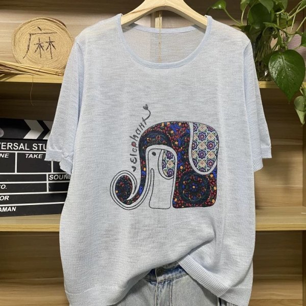 > 25zy サマーニット レディース トップス 高質 ラフ 麻タッチニット チュニック ナチュラル 麻混 サラサラ 涼感 クールネック プリント柄5