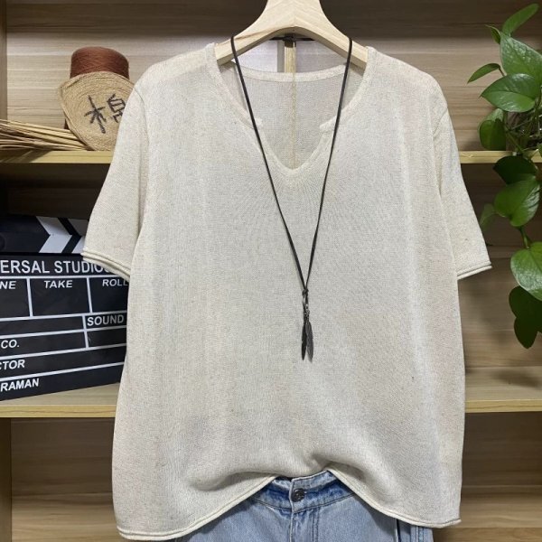 - 25zy サマーニット トップス 高質 ラフ 麻タッチニット チュニック ナチュラル 麻混 サラサラ 涼感 Vネック ベージュ系
