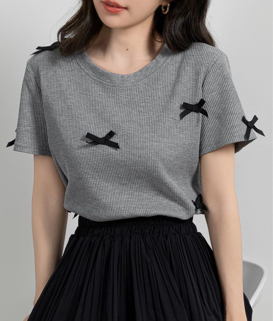 - 新品 デイクローゼット レディース 半袖リボンワッフルクロップドTシャツ グレー