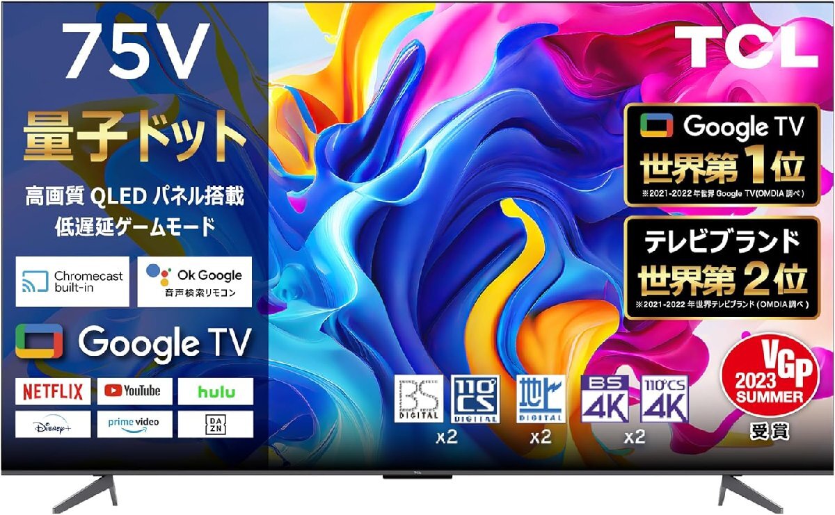 - 【最新ディスプレイ技術採用】量子ドットLED技術「QLED」を採用。TCL QLEDテクノロジーは、色域を最大限に拡大し、より純粋なカラーを映し出し、鮮烈な映像を描きます。