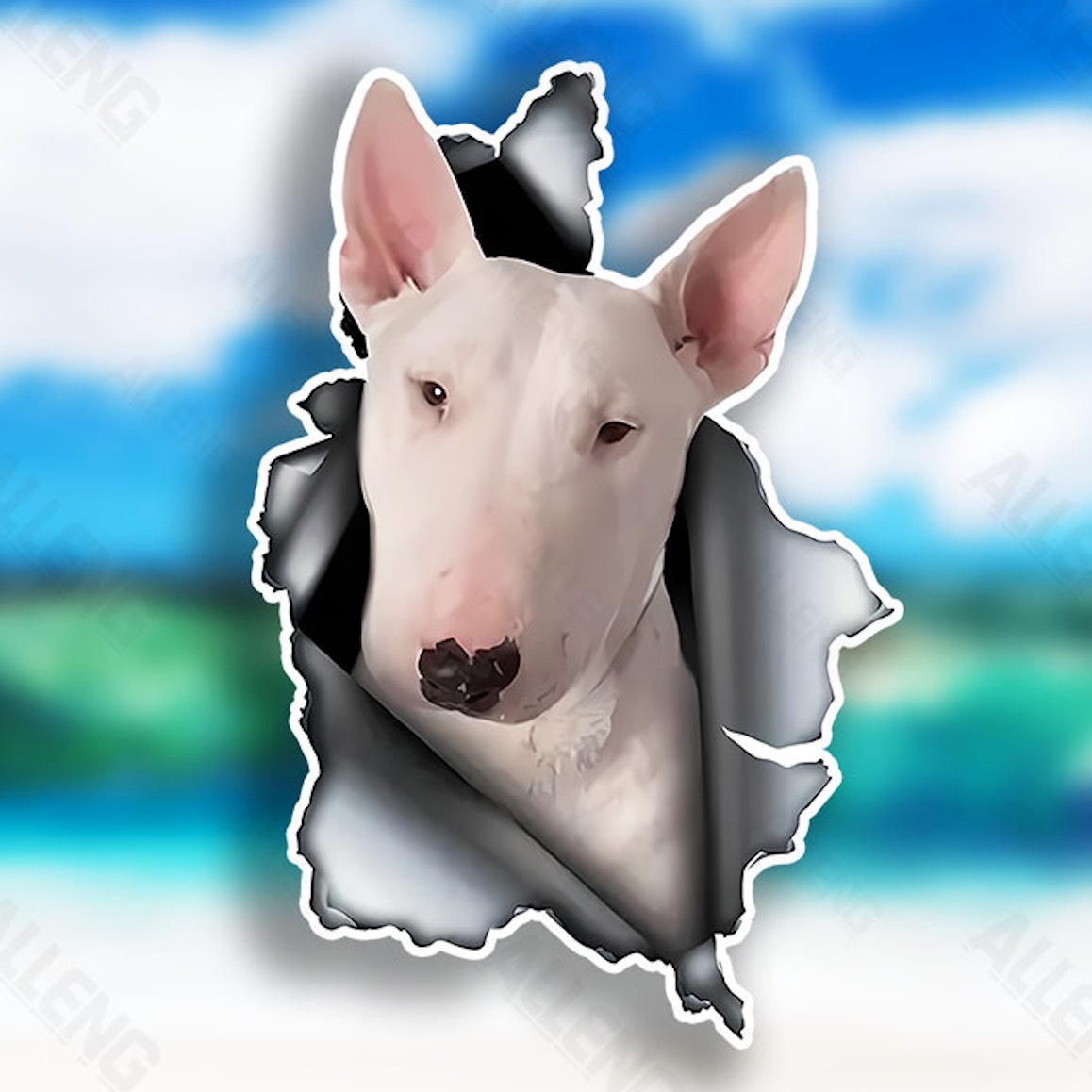 - ステッカー 白犬 ブルテリア 15cm 防水 ビニール素材 インテリア 貼り付け シール いぬ 車用 壁穴から顔を出すイヌ ノートパソコン t7288