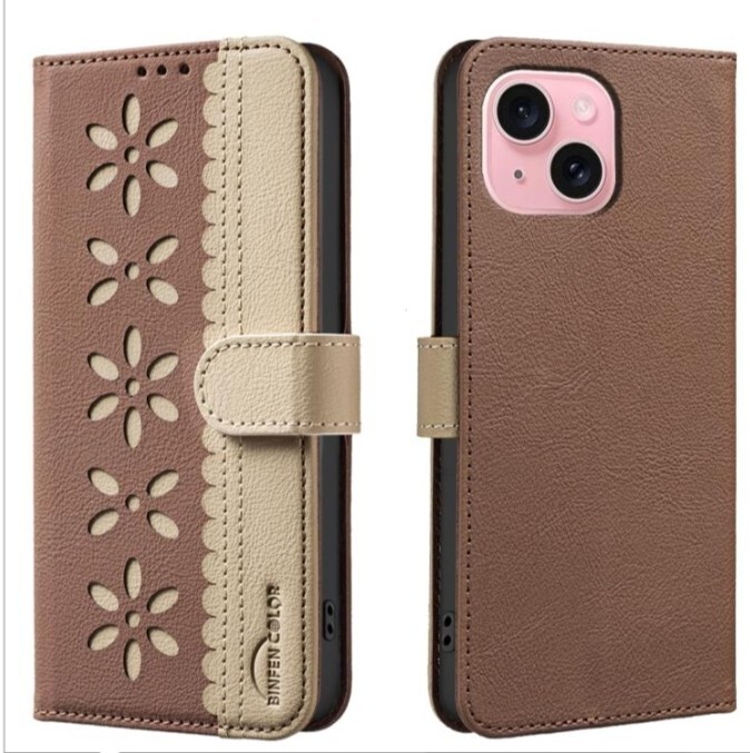 > iPhone13 / iPhone14 フラワー柄 ブラウン×ベージュ 手帳ケース