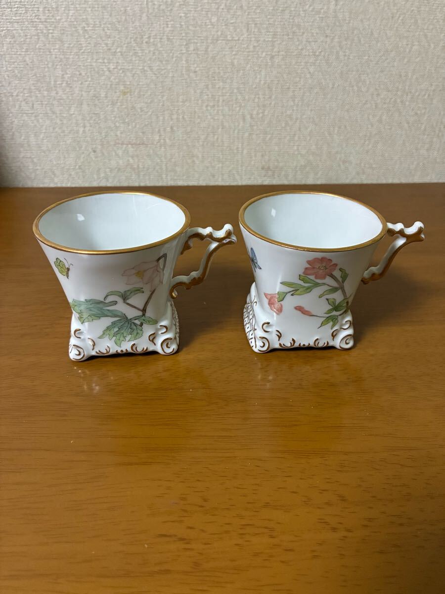 > Lindner リンドナー ドイツ製 Handarbeit ペア カップ 2客 セット 金彩 花柄 陶器 中古 現状品 送料無料 ティーカップ