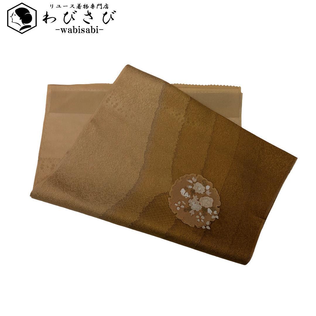 黄茶色ベースの染分けのお色味に雪輪に花模様がデザインされた素敵なお品でございます。