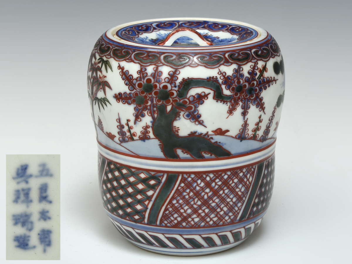 - 時代 祥瑞写 胴紐水指 高:15.5cm 在銘 五良太甫呉祥瑞造 色絵 共蓋 茶道具 陶磁器 古陶磁 (検) 景徳鎮 唐物 古玩 u0599t