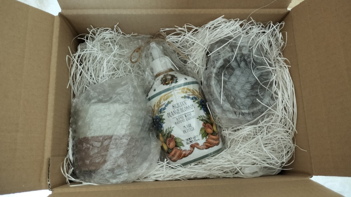 > 【送料込み】マヨルカ イタリア製プッシュボトルのハンドウォッシュ、7枚合わせ蚊帳生地布巾、マグカップ2個 以上4点セット
