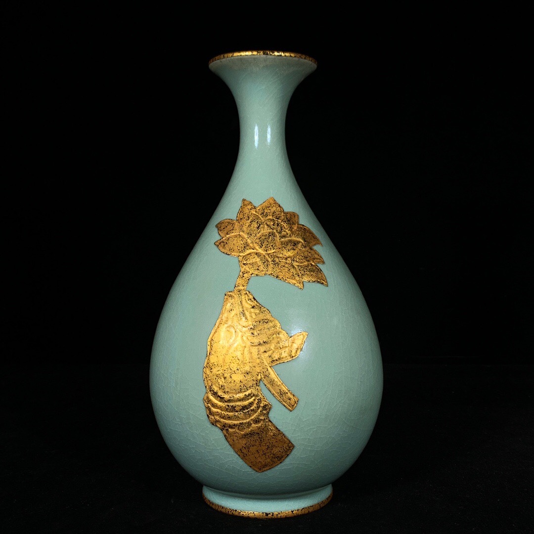 - 蔵友旧蔵出 宋 汝窯 包口 金嵌 仏手蓮花紋 玉壺春瓶 稀少珍品 貴重品 古陶瓷品 置物 古賞物 中国古玩 中国古美術品