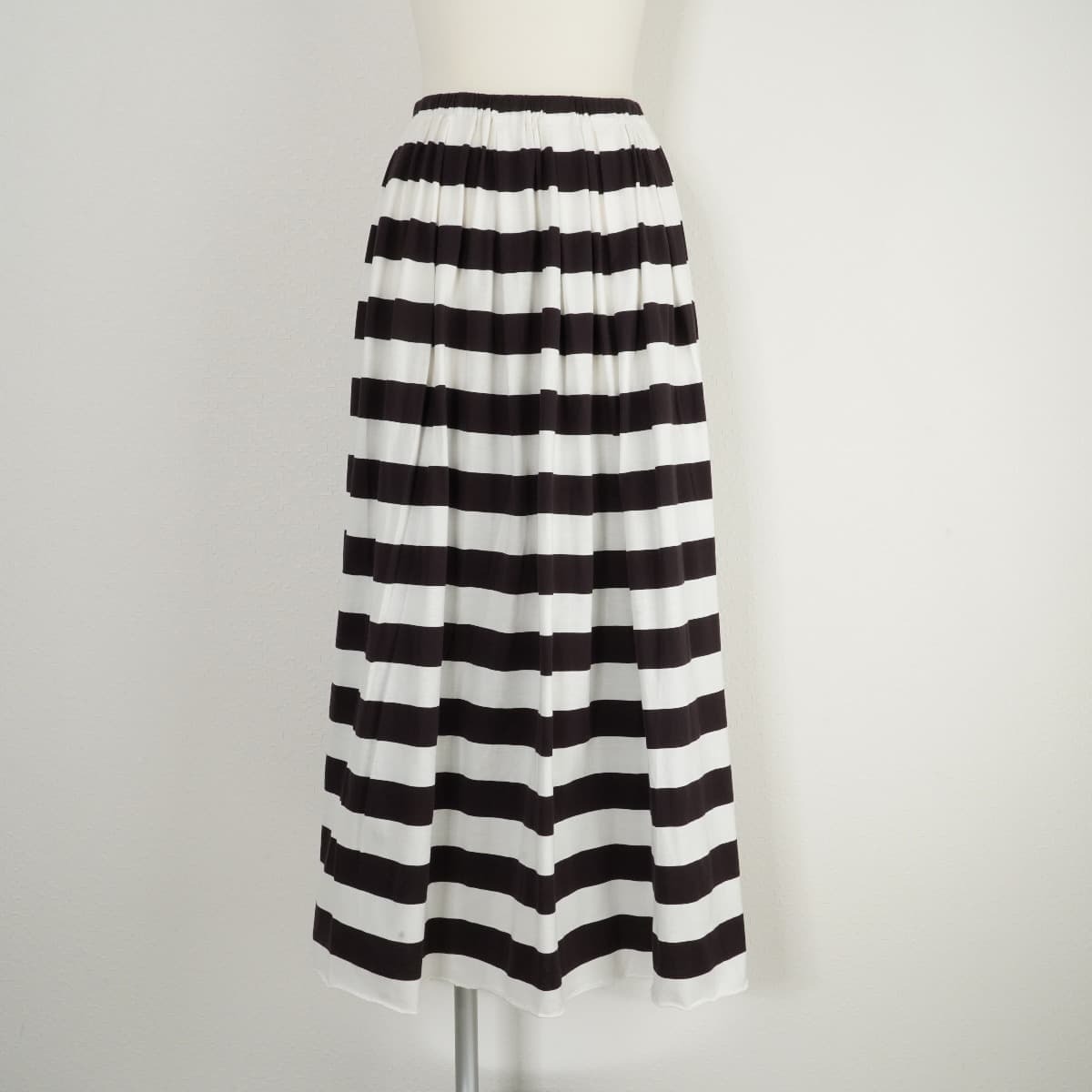 コメント:太ボーダーが目を引くロングスカート。カットソーのような着心地良い綿素材です。ウエストにタックがあり、裾に広がるフレアデザイン。ウエストは総ゴムです。裾は切りっぱなしデザインです。