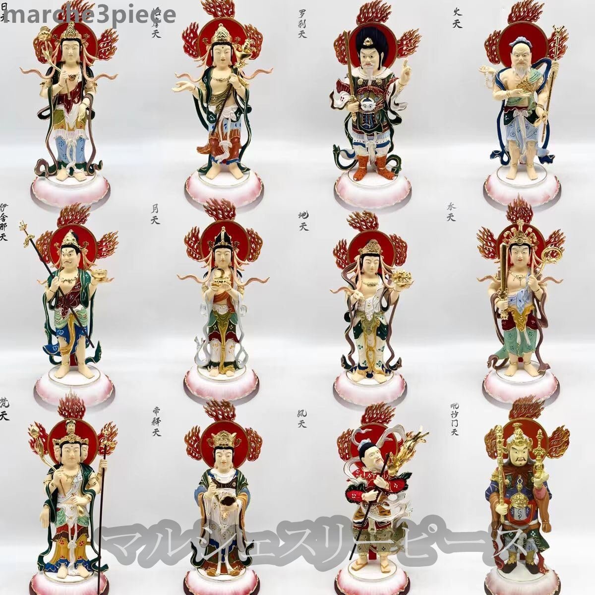 - 仏像 十二天 立像 帝釋天 火天 ’摩天 羅刹天 水天 風天 多聞天 伊舍那天 梵天 地天 日天 月天12個セット 桧木 木彫仏像木製 総高30cm(B)