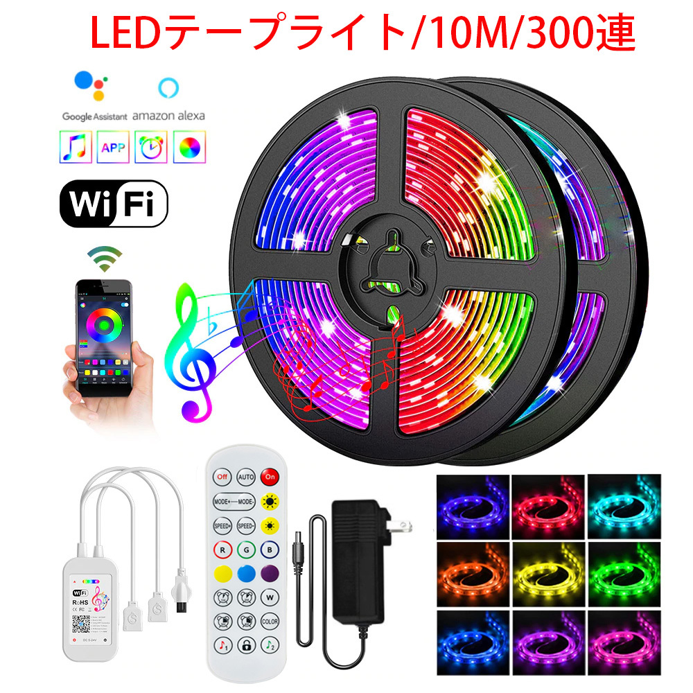 - LEDテープライト ストリップライト 5050RGB 10m 300連 両面テープ 正面発光 車 12V リモコン/APP制御 防水 高輝度 切断可能 間接照明 装飾